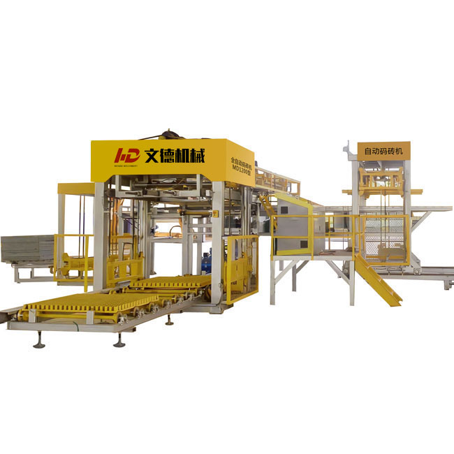 當(dāng)前市場(chǎng)上水泥磚機(jī)生產(chǎn)線成品磚需由人工碼垛、勞動(dòng)強(qiáng)度大、生產(chǎn)效率低,針對(duì)這一問題泉州文德機(jī)械公司研發(fā)生產(chǎn)一種自動(dòng)碼磚打包的生產(chǎn)線設(shè)備,該設(shè)備可獨(dú)立放置于產(chǎn)品養(yǎng)護(hù)堆場(chǎng)附近,對(duì)于養(yǎng)護(hù)好的制品就地碼垛。